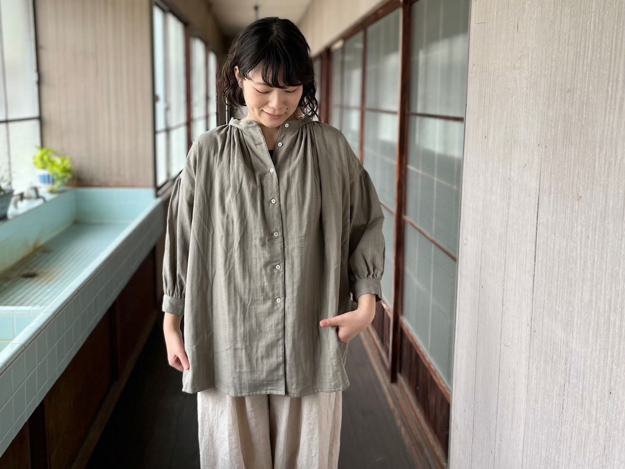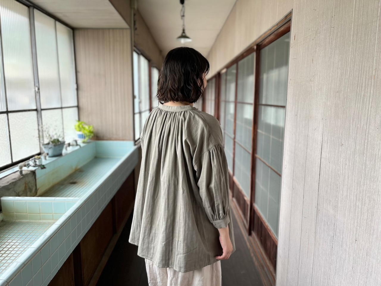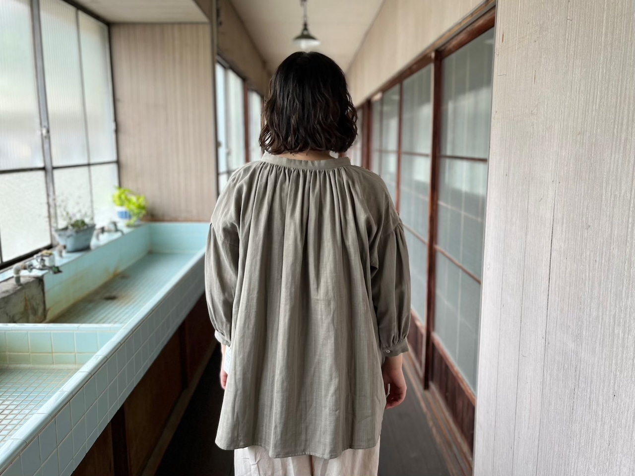 首元にたっぷりと入ったギャザー、ボリューム感のある裾と、ふんわり広がるバルーン袖、少し長めのチュニック丈