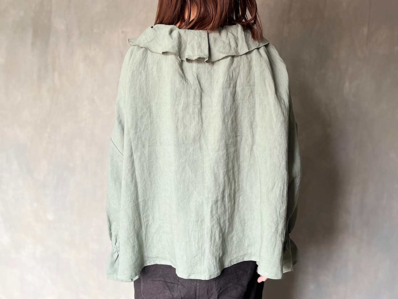 ボレロ風花びら襟ブラウス。やさしく咲く花びらをイメージした襟が印象的なブラウス。一枚一枚を重ねたような襟元が顔まわりをふんわり彩り、甘すぎず大人の可憐さをそっと引き出します。首元の紐でシルエット調整ができ、ギャザーの寄せ具合で雰囲気を変えて楽しめます。ショート丈で軽やかなボレロ風のデザインは、さっと羽織るのにもぴったり。動きやすくリラックスした着心地も魅力です。お袖はゴム入りでフリルを作り、腕まわりにやさしい立体感と柔らかいニュアンスを添えます。シンプルな中にも細部にこだわりを込めた、ナチュラルにもフェミニンにも寄り添う一着です。