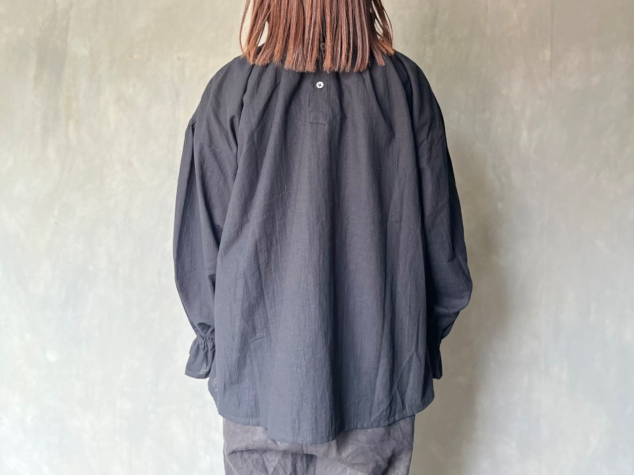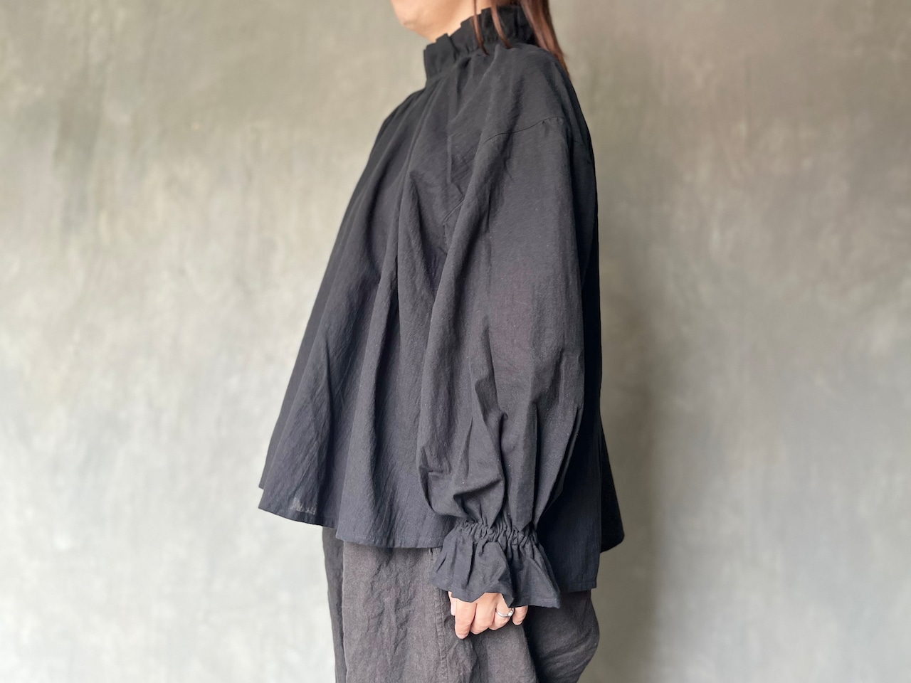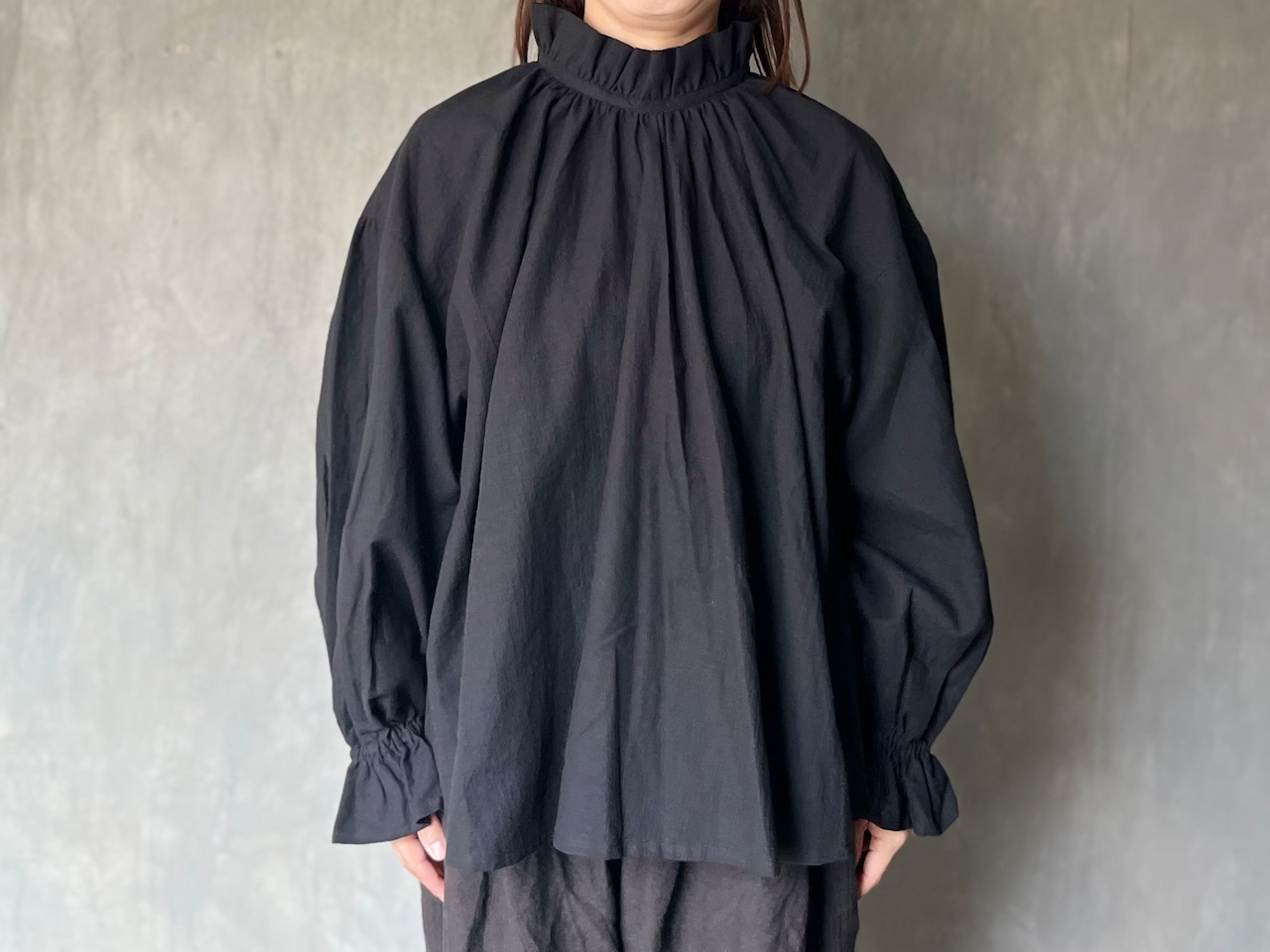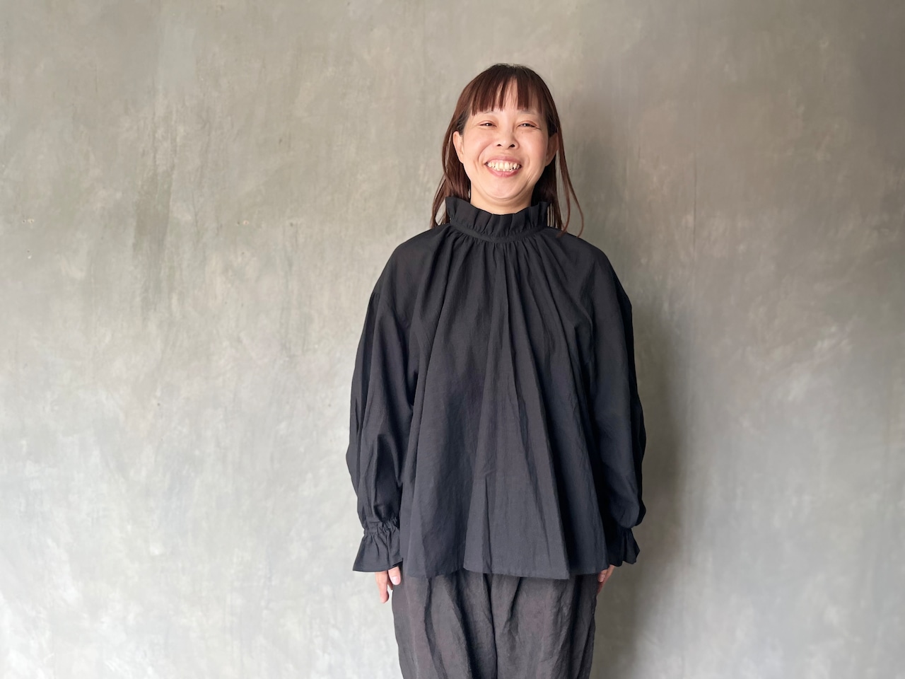 首元とお袖のフリルが乙女心をくすぐるブラウスです。綿70% 麻30%の綿麻素材でさらりと着ていただけます。首元からギャザーが広がり、見頃がゆったりのデザイン。ベストやパンツなどと重ね着をお楽しみいただける1着です。