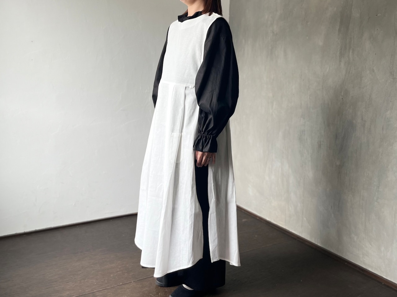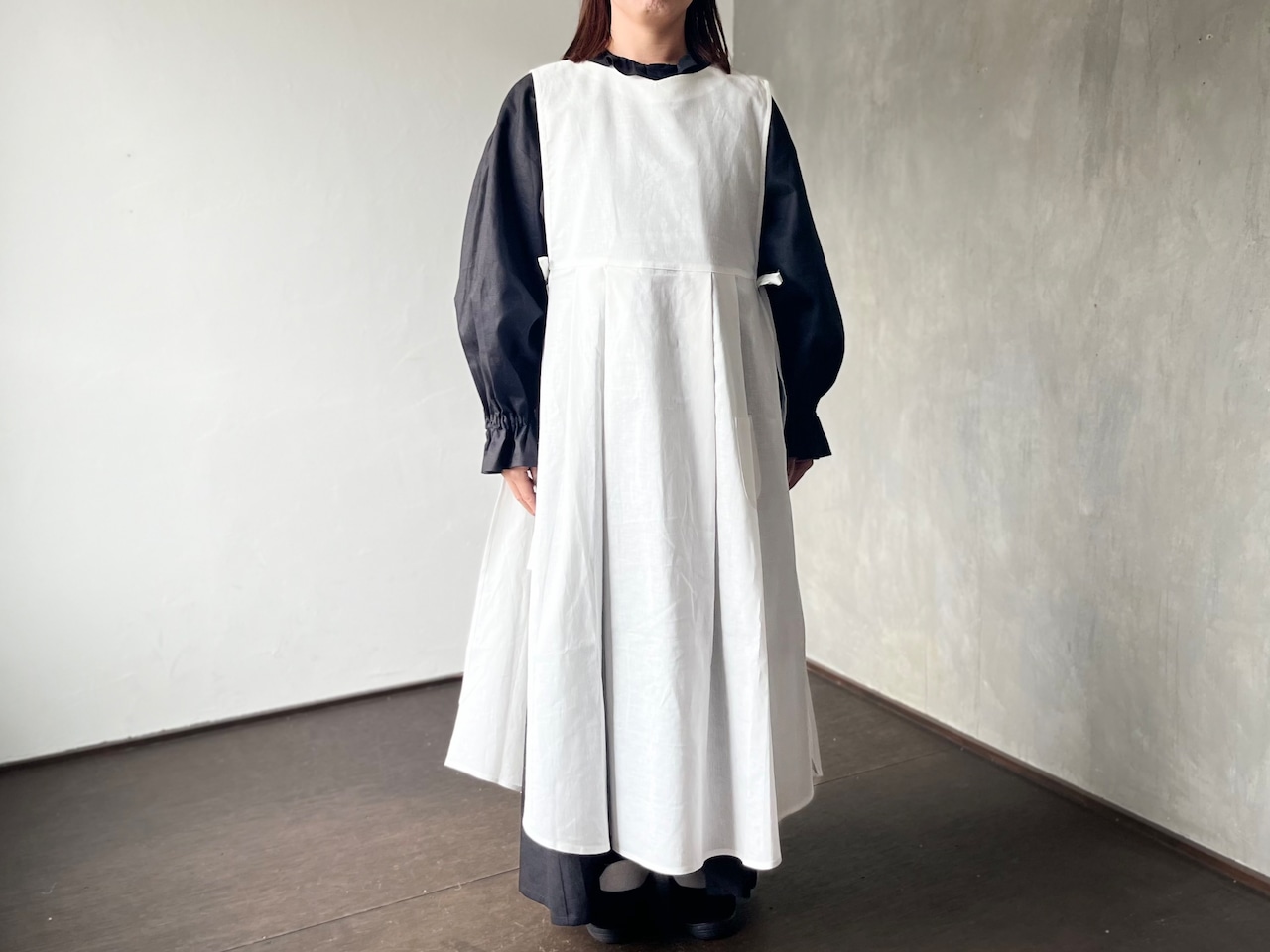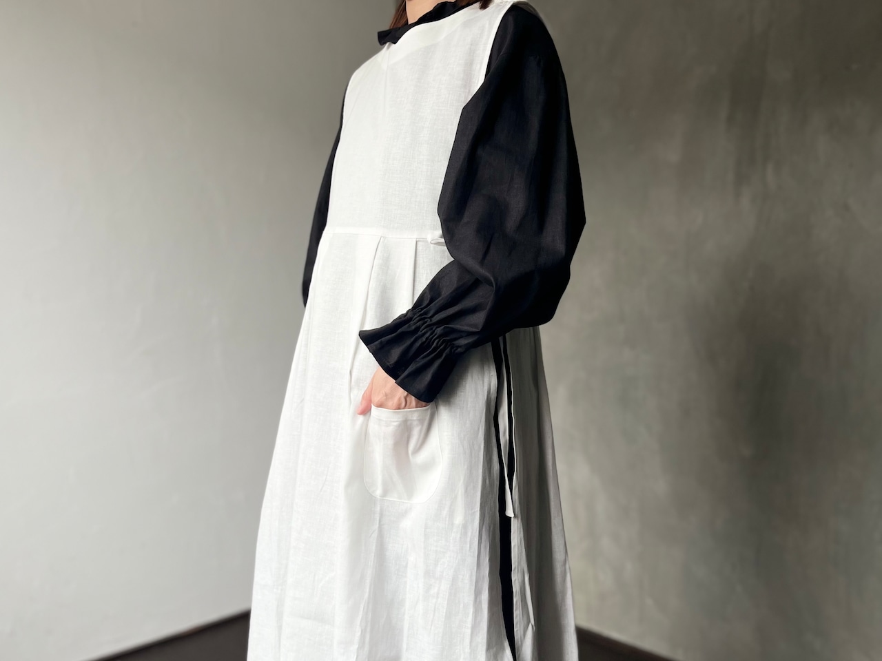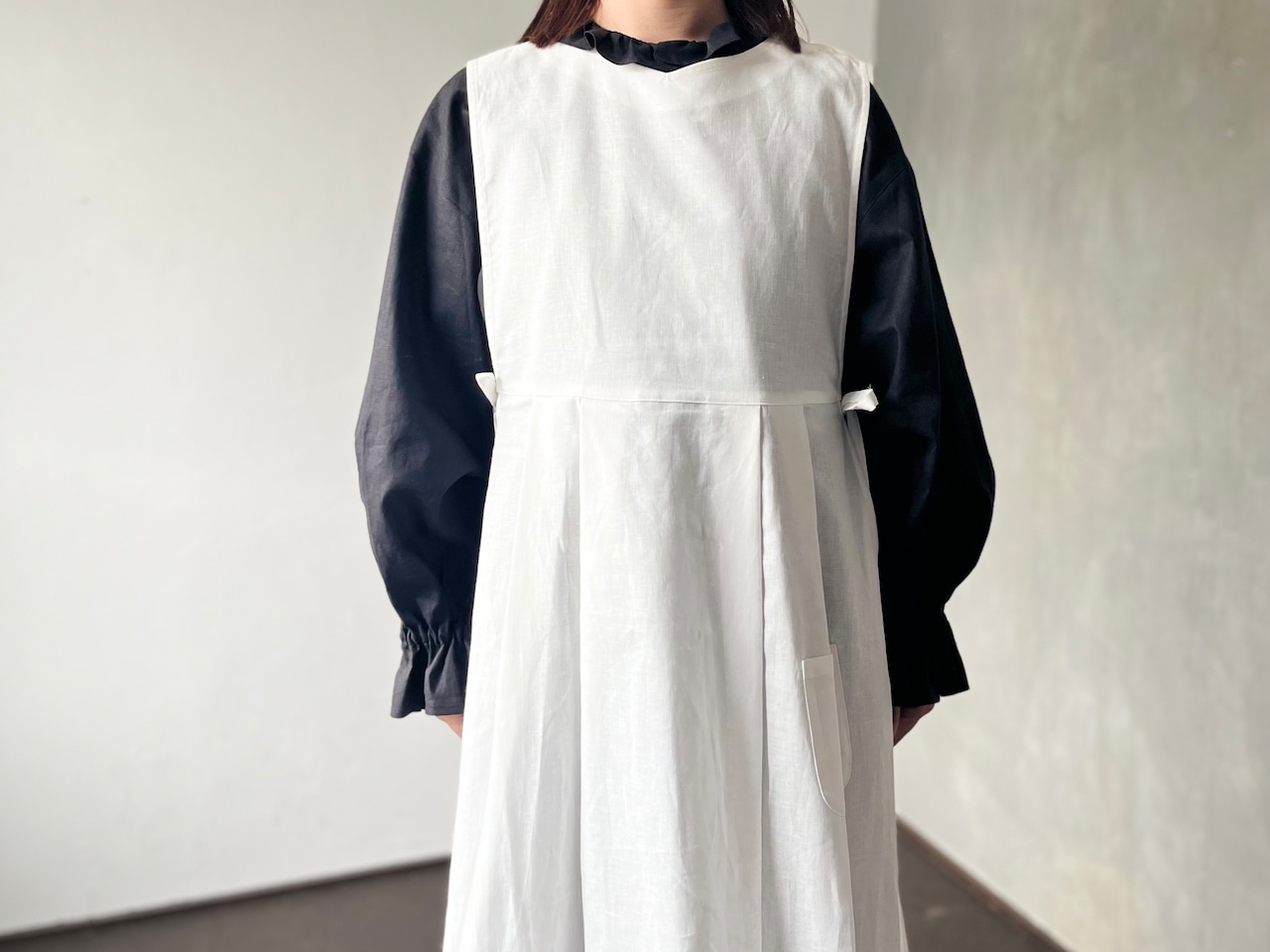 サイドの紐の結び方が2パターンのアレンジが出来るエプロン型のワンピースです。 紐を前後に結ぶとウエストマークができメリハリがつきます。 両サイドで結ぶとふわりとしたシルエットになり、中に着るワンピースやパンツなどの合わせ方を楽しめます。 緩やかなVネックと装飾をなくした胸あてがすっきりと大人の女性のコーディネートにほどよく寄り添ってくれます。 左肩に2個ついた貝ボタンがアクセントであり着脱も楽にしていただけます。 小さなポケットには小さなレースのハンカチやハーブのポプリをそっと忍ばせてみるのもおすすめです。