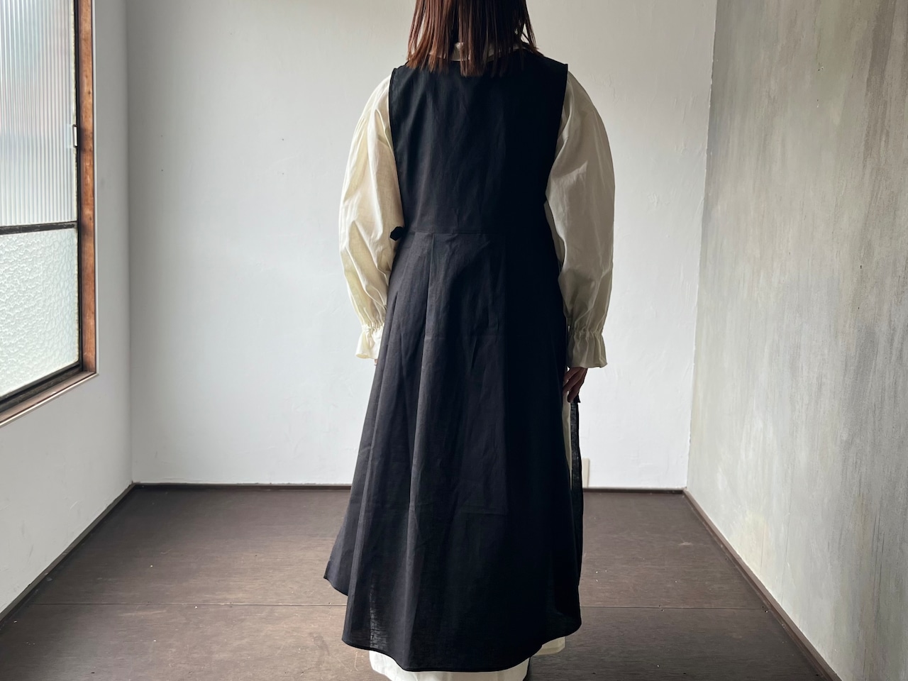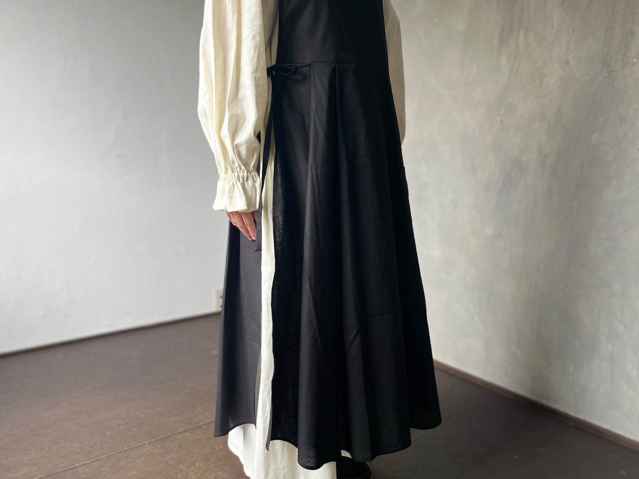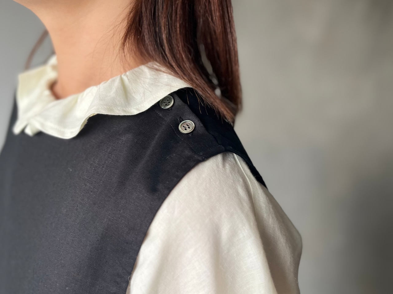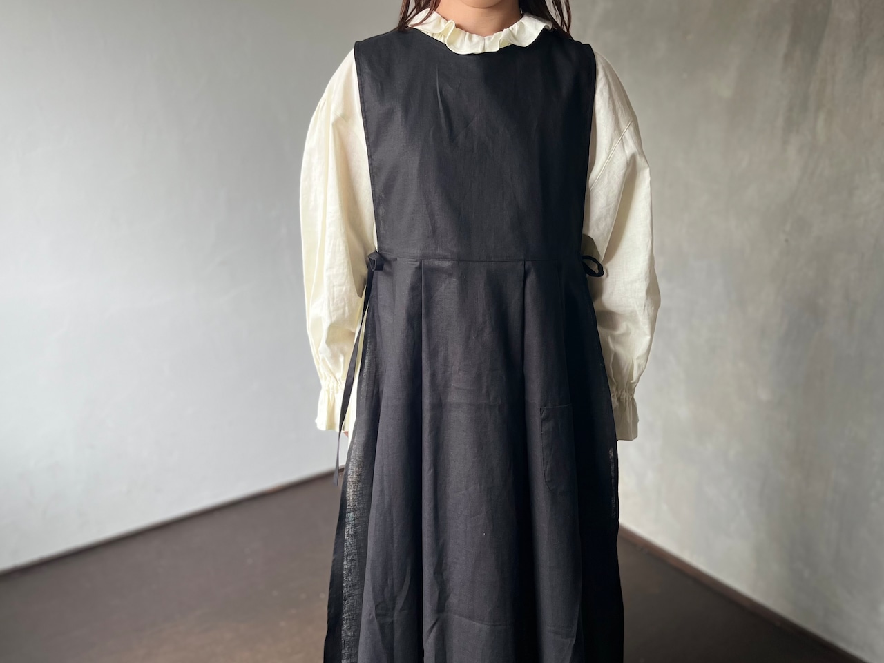 サイドの紐の結び方が2パターンのアレンジが出来るエプロン型のワンピースです。 紐を前後に結ぶとウエストマークができメリハリがつきます。 両サイドで結ぶとふわりとしたシルエットになり、中に着るワンピースやパンツなどの合わせ方を楽しめます。 緩やかなVネックと装飾をなくした胸あてがすっきりと大人の女性のコーディネートにほどよく寄り添ってくれます。 左肩に2個ついた貝ボタンがアクセントであり着脱も楽にしていただけます。 小さなポケットには小さなレースのハンカチやハーブのポプリをそっと忍ばせてみるのもおすすめです。