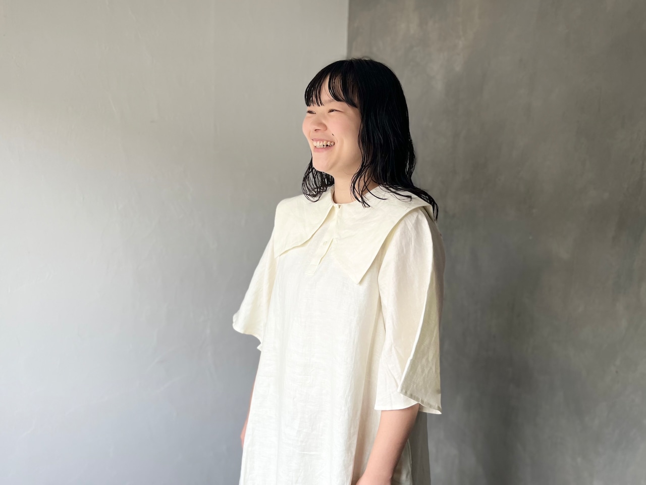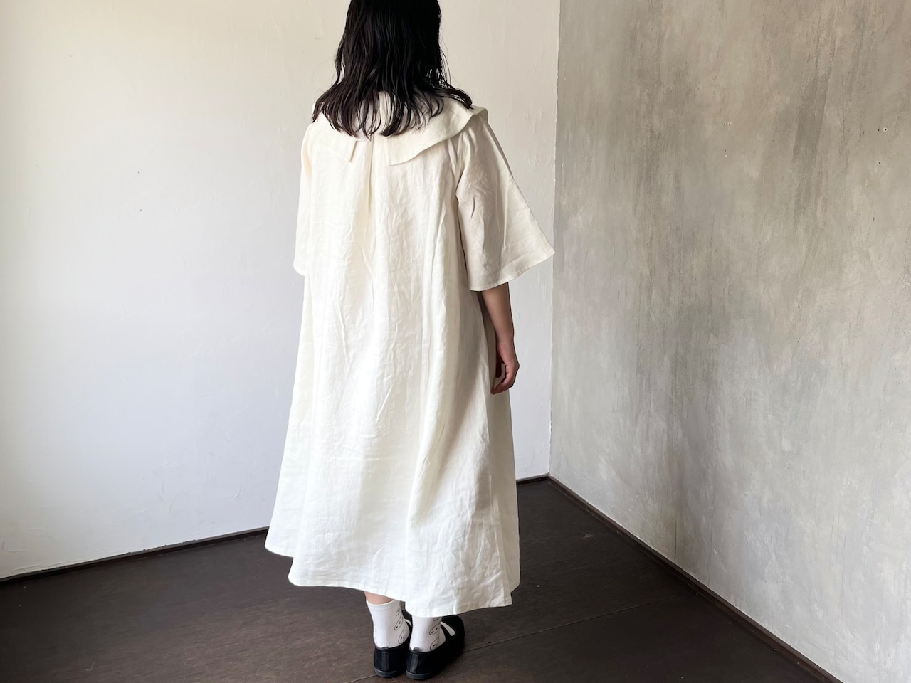 ジゼルブラウス すっきりとしたAラインのシルエットにひじ下のフレアスリーブが心地よく腕を纏います。特徴的なかたちの襟はシンプルながらもアクセントに、ワンピースを一枚で着て完成される便利なアイテムです。後ろ編み上げギャザーエプロンを巻いてみたり、エプロンワンピースと重ねてみたりと、Johannaのその他のアイテムとのコーディネートもお楽しみいただけます。