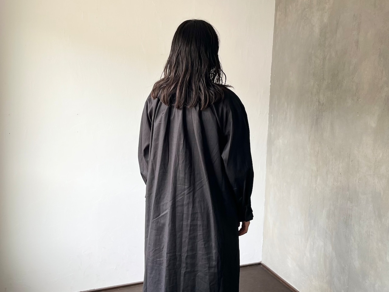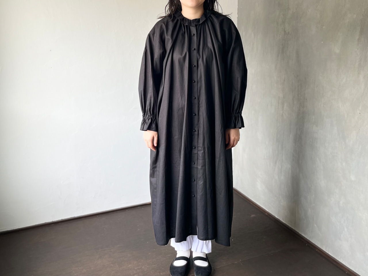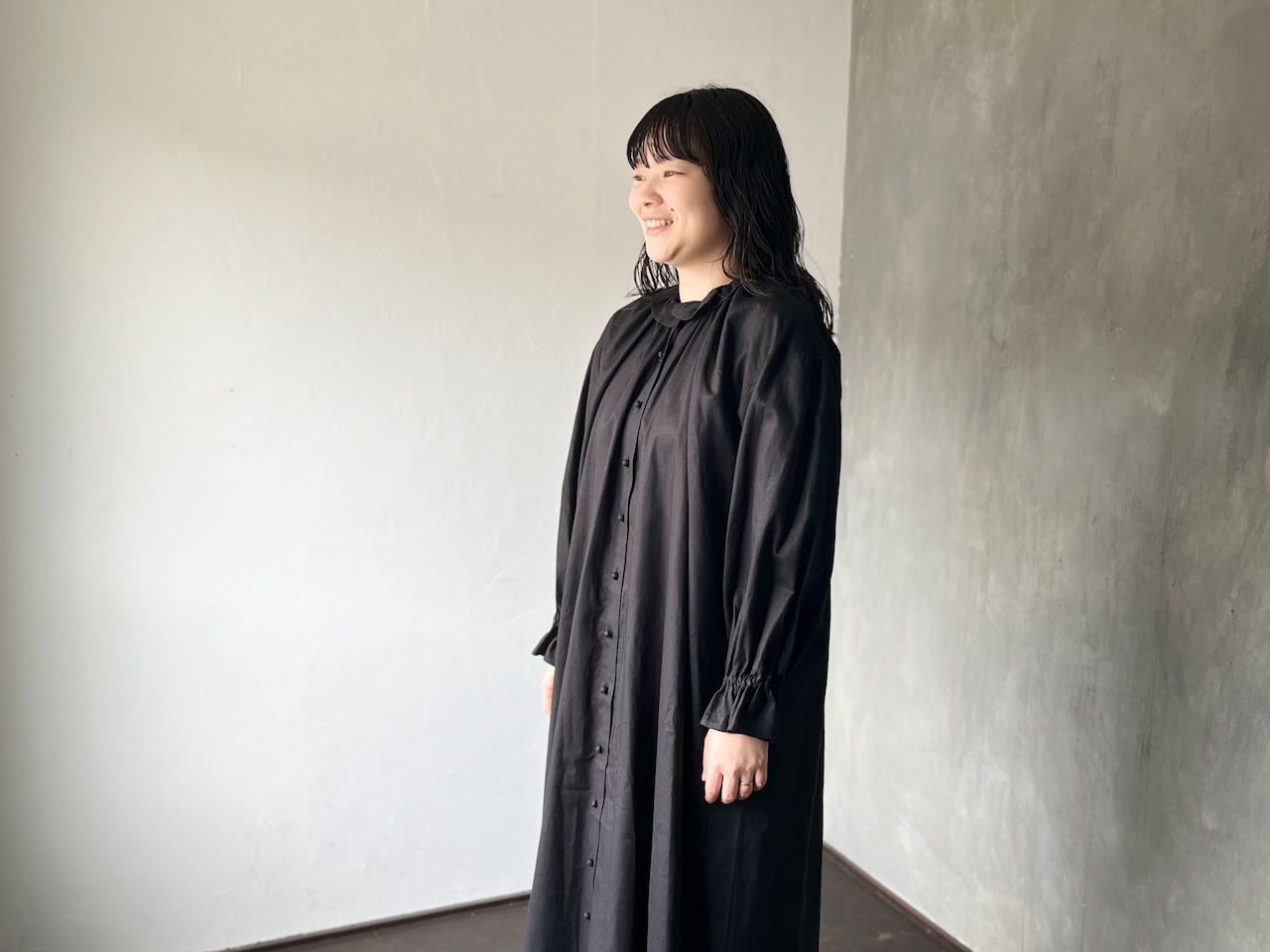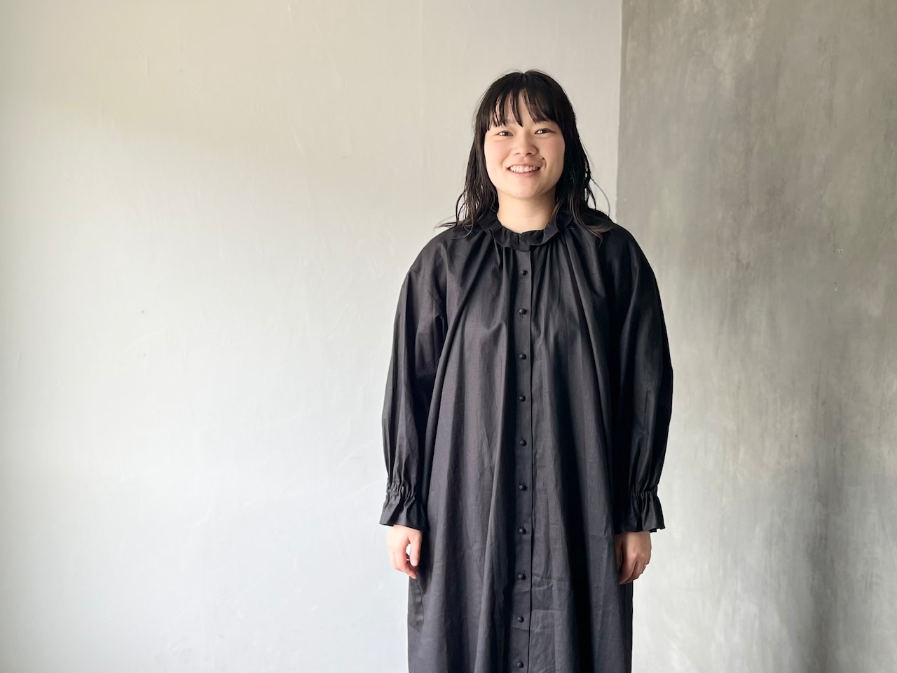 首元とお袖のフリルは花びらのイメージで、ポツポツ並んだ小さなくるみボタンも小さな蕾の様。首元から裾まで施したギャザーが華やかなシルエットです。ボタンを途中までとめて中のアイテムとの重ね着で別の表情が見えたり、羽織の様な着こなしも楽しめます。