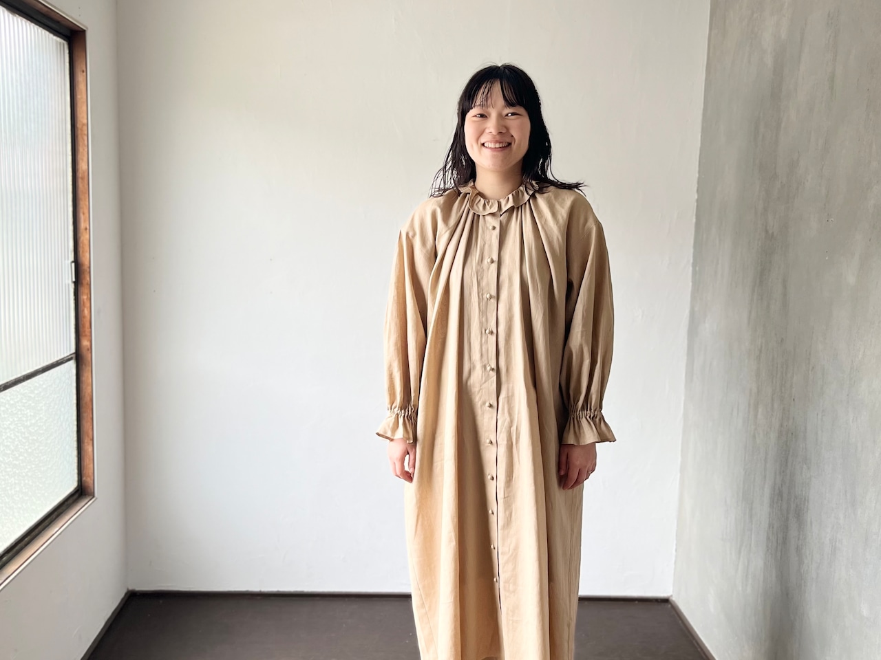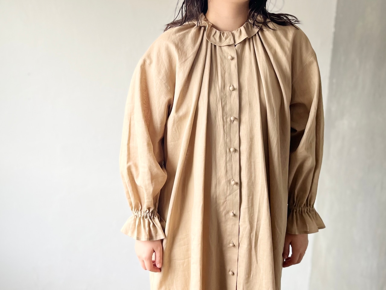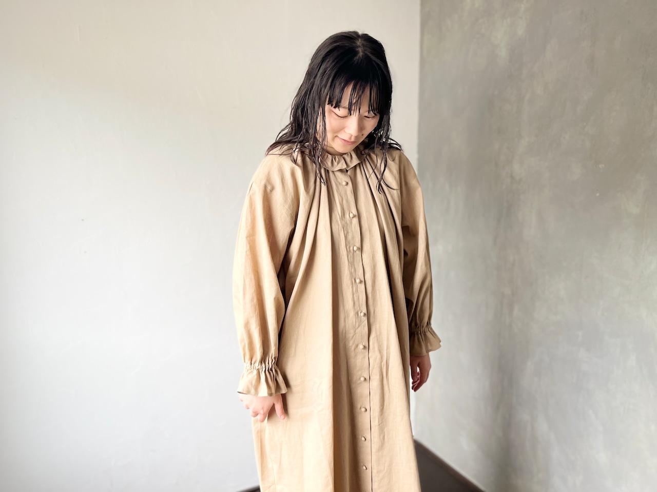 首元とお袖のフリルは花びらのイメージで、ポツポツ並んだ小さなくるみボタンも小さな蕾の様。首元から裾まで施したギャザーが華やかなシルエットです。ボタンを途中までとめて中のアイテムとの重ね着で別の表情が見えたり、羽織の様な着こなしも楽しめます。