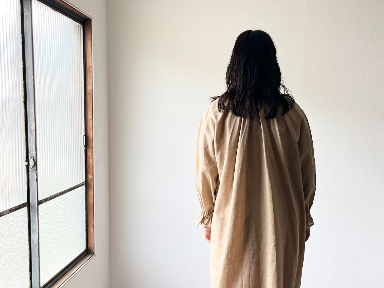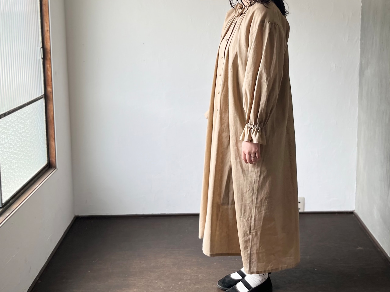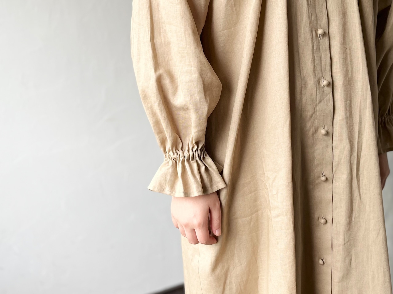 首元とお袖のフリルは花びらのイメージで、ポツポツ並んだ小さなくるみボタンも小さな蕾の様。首元から裾まで施したギャザーが華やかなシルエットです。ボタンを途中までとめて中のアイテムとの重ね着で別の表情が見えたり、羽織の様な着こなしも楽しめます。