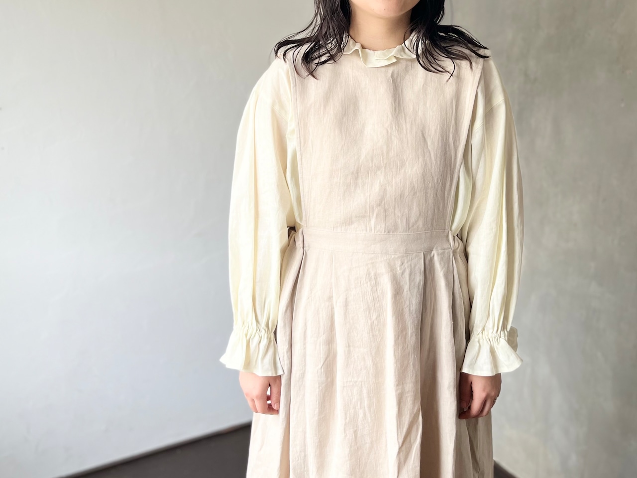 後ろにお行儀よく並んだ3つのリボンが印象的。遠い昔の女の子達が着るときに結びっこする絵がイメージできます。リボン結びを縦にならないように、とびきり可愛く結べるように。左肩に付いたボタンは開閉できるので切る前に結び整えてからかぶって着ることができます。後ろの腰から下の貝ボタンも開けられるのでコーディネートによっては途中まで開けたり全開にして中のスカートなど見せてくるのもかわいいです。首周り詰まり具合いや胸あてラインもきりりと、クラシカルな雰囲気。