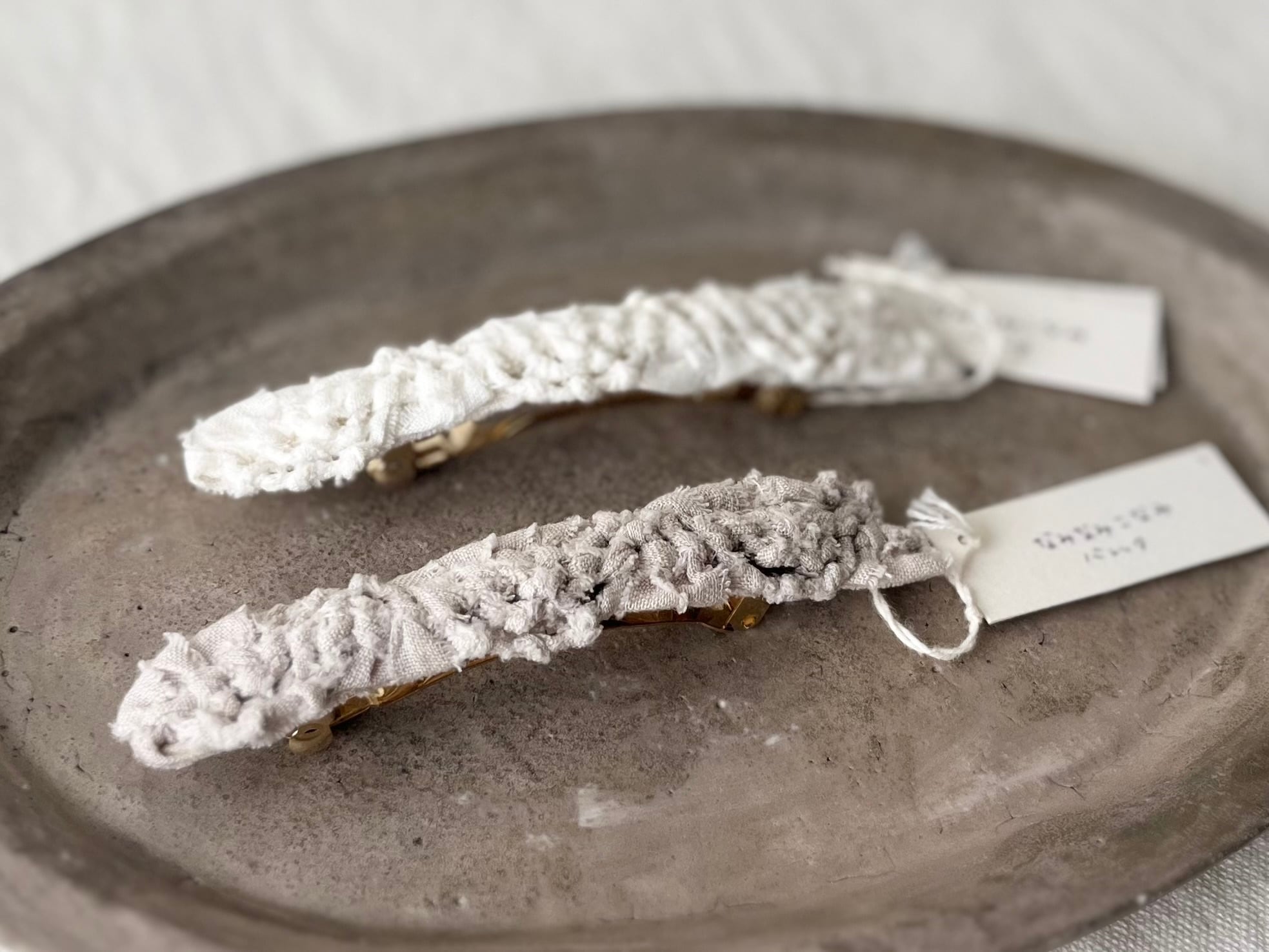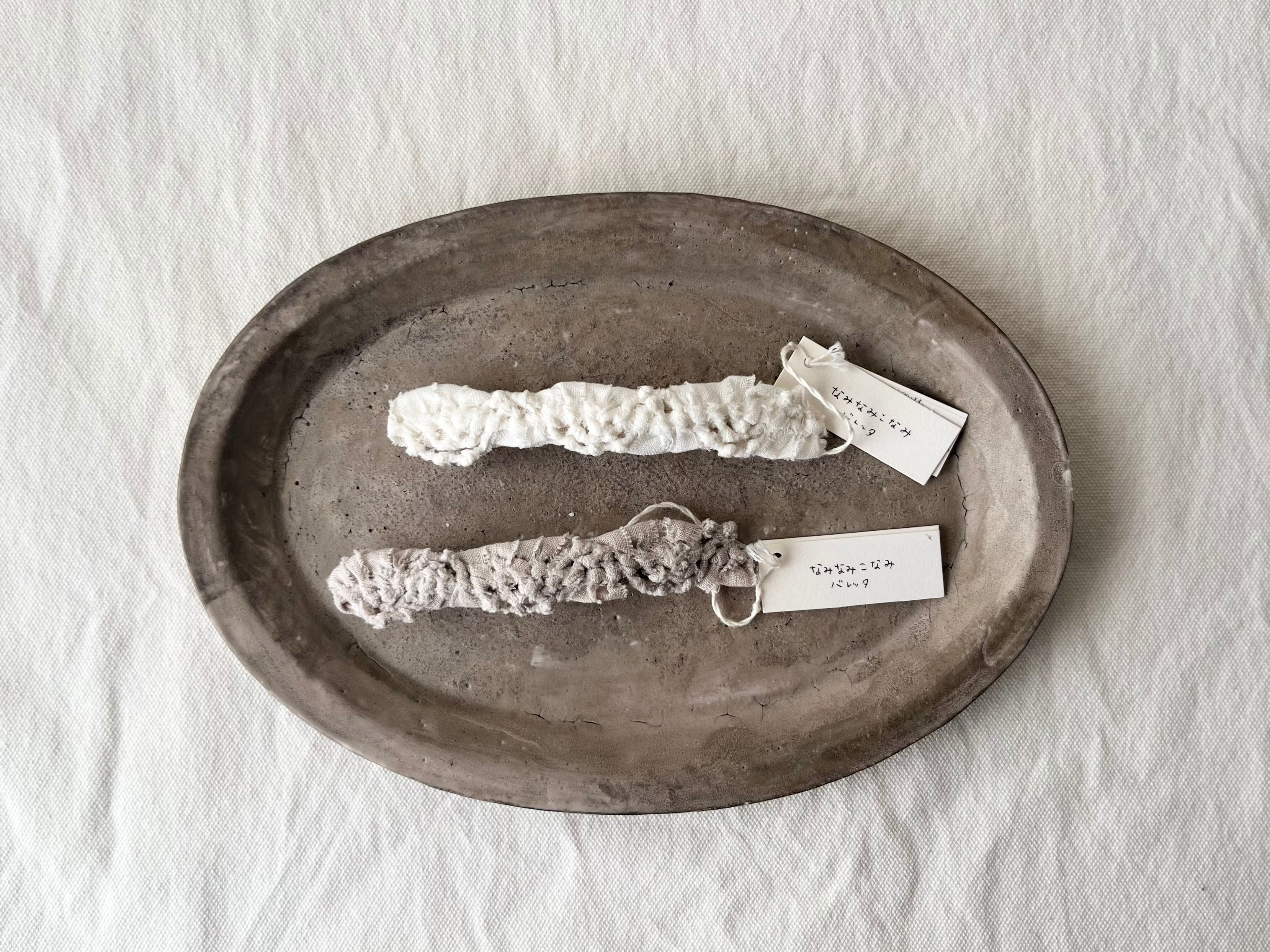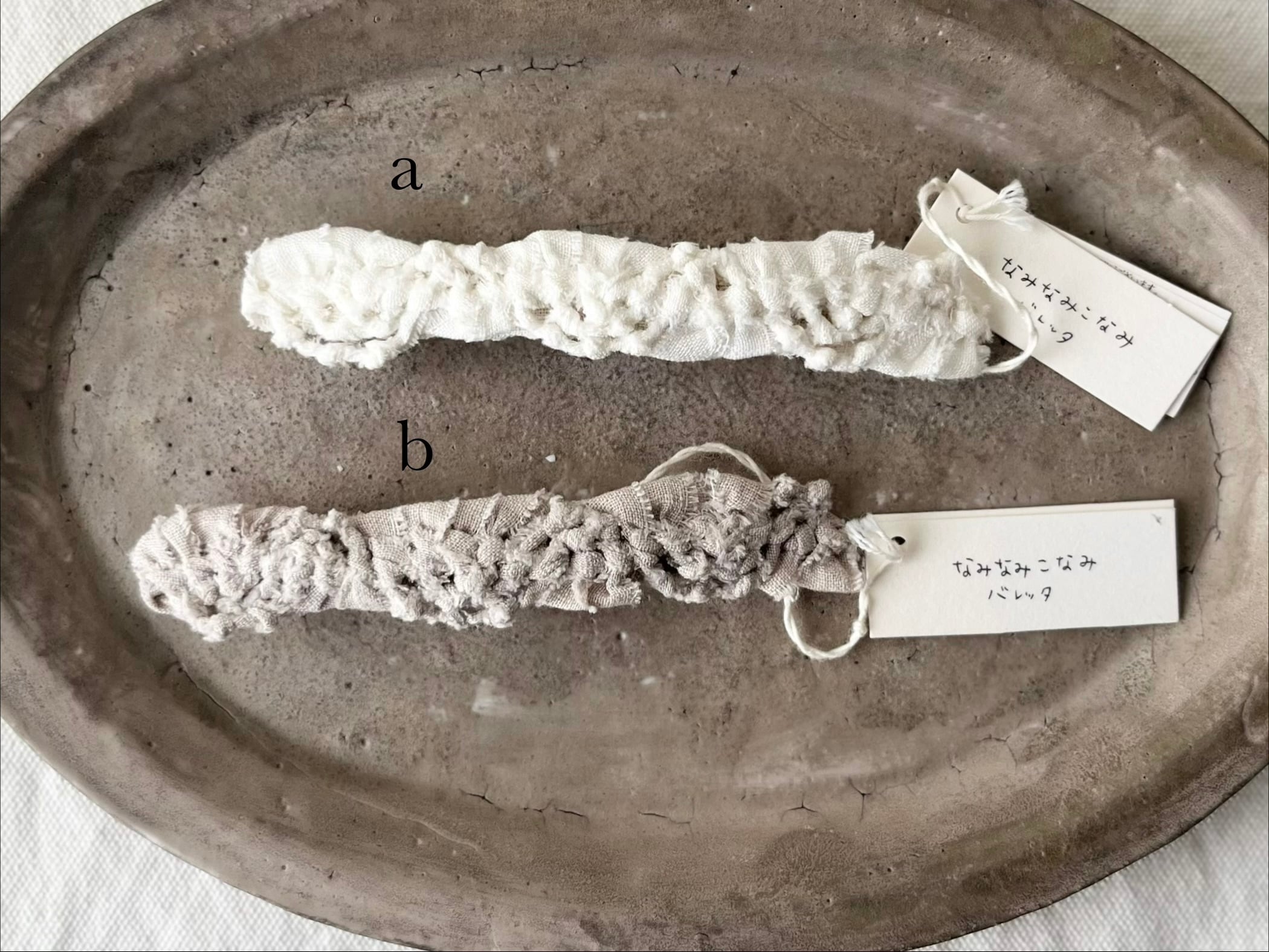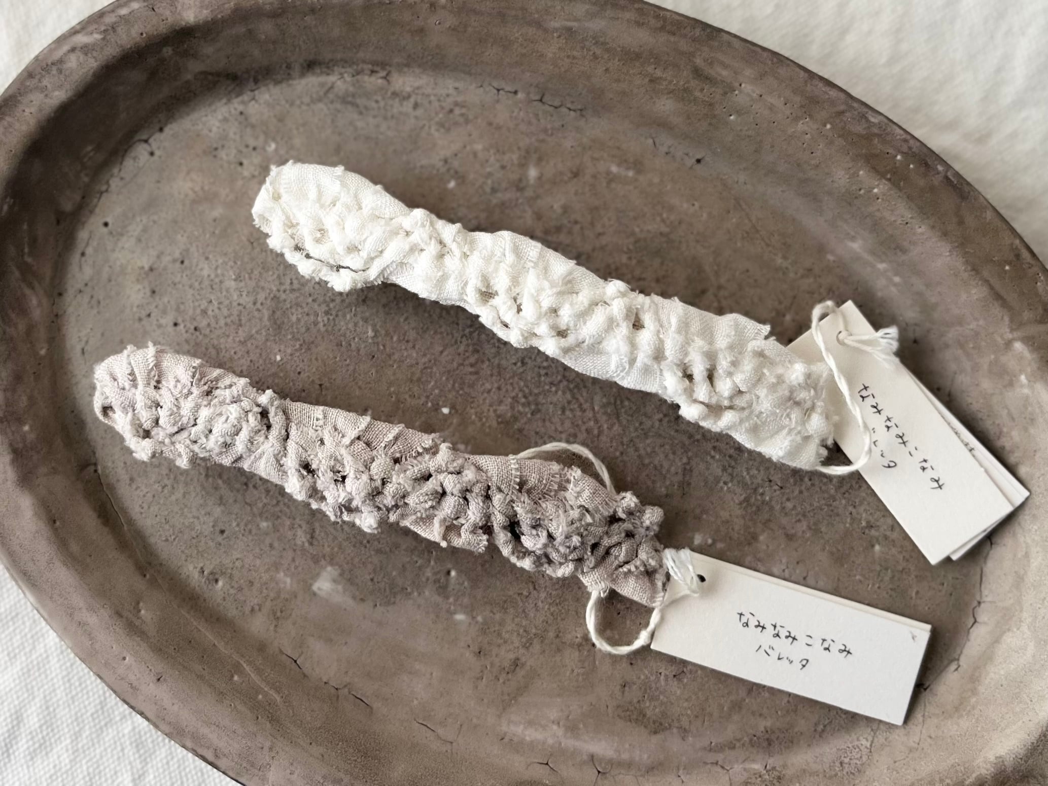 コットンやリネン生地を裂いて編んだりまとめたり、天然石やウッドビーズなど様々な素材と組み合わせたり、自由な発想でアクセサリーやバッグを製作しています。