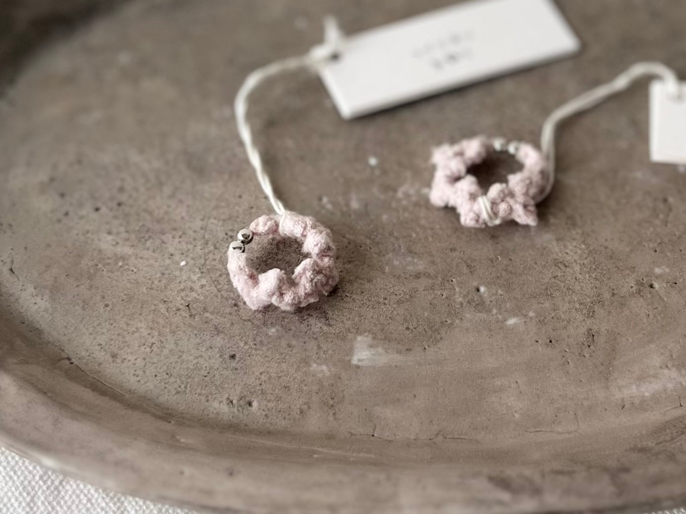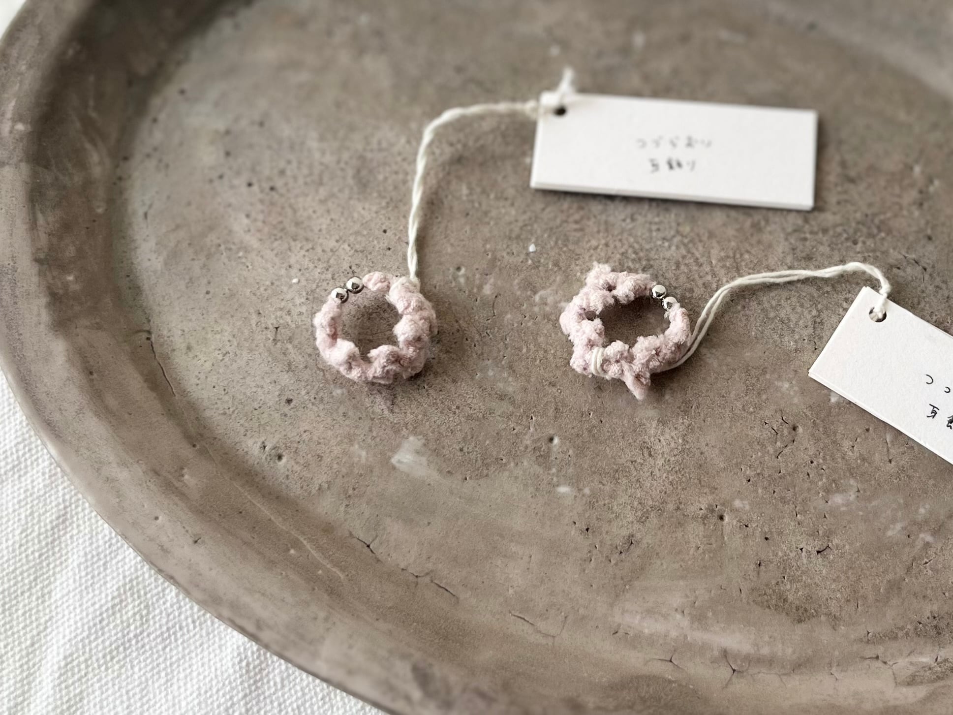 コットンやリネン生地を裂いて編んだりまとめたり、天然石やウッドビーズなど様々な素材と組み合わせたり、自由な発想でアクセサリーやバッグを製作しています。