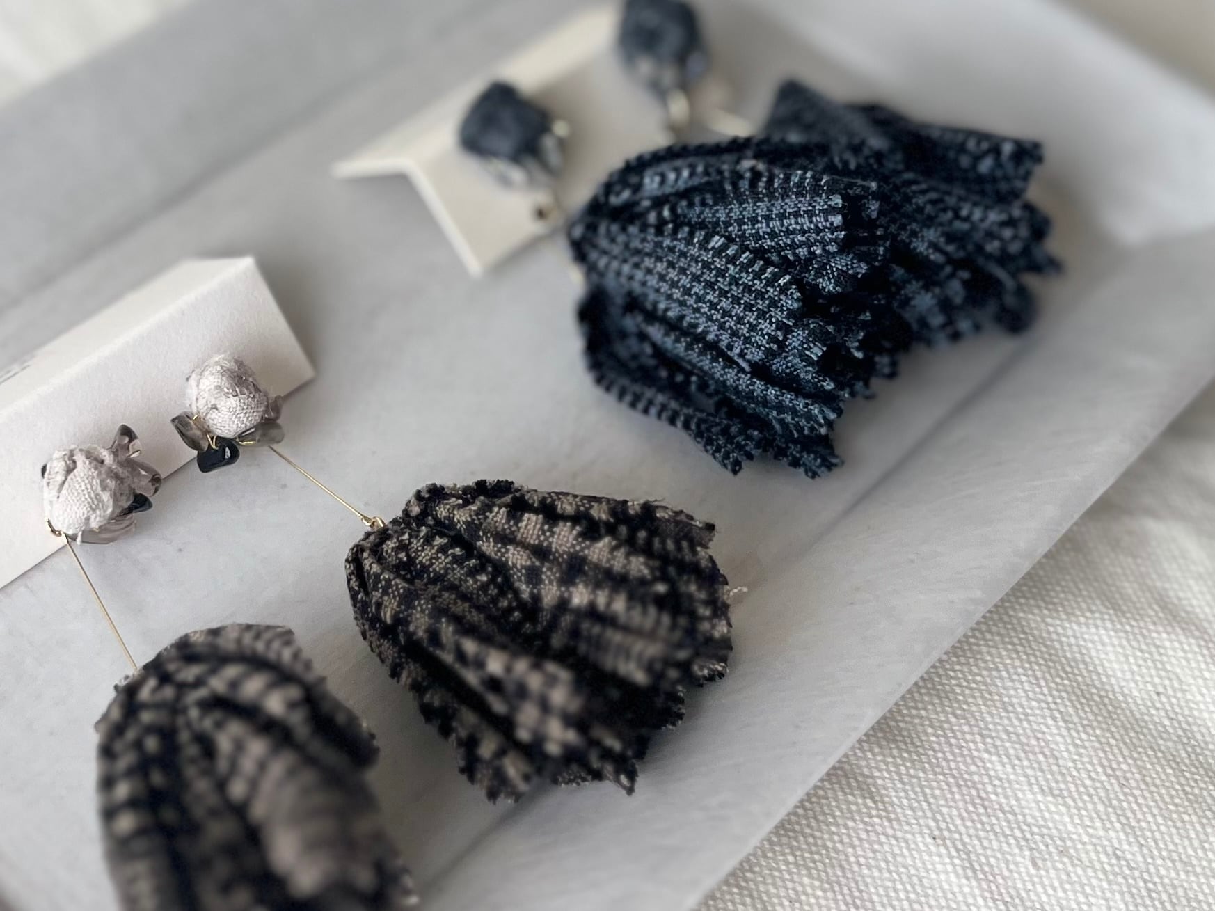 コットンやリネン生地を裂いて編んだりまとめたり、天然石やウッドビーズなど様々な素材と組み合わせたり、自由な発想でアクセサリーやバッグを製作しています。